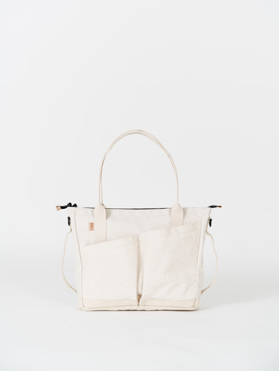 A Meridian shop exclusive designed in collaboration with 1733, The Daily Tote in Natural X10 is designed to keep your work and travel essentials organized and accessible. Variable carry options and extensive, thoughtful pockets allow this bag to suit a variety of needs. A freestanding tote with a padded bottom, the Daily Tote maintains its structure and style no matter where you take it. A padded laptop sleeve protects up to a 15” device and the water resistant materials and zippers fend off the elements. "V2" of The Daily Tote features slightly tweaked dimensions, and this limited colorway is is finished with a stamped vegetable-tanned leather tag and trim.