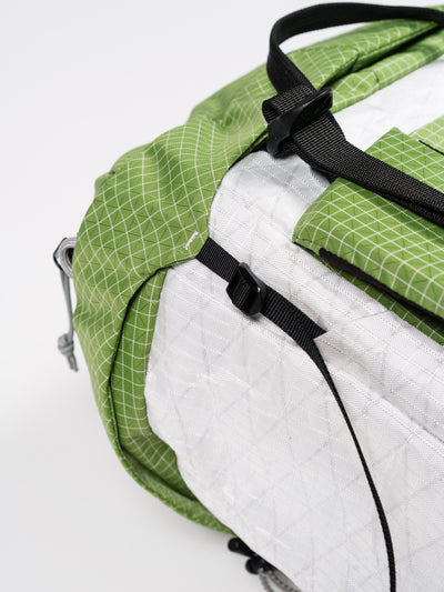 The Rucksack's hybrid fabric construction is inspired by the moss and rock formations commonly seen throughout the mountains of the nearby Catskill and Taconic ranges. 210D Gridstop is a lightweight woven nylon reinforced with a 6mm x 6mm ripstop grid of Dyneema® yarns giving it the effective strength of a much heavier material. This creates a textile with high abrasion and tear resistance in a flexible and lightweight package while the Polyurethane backside and DWR top coating provide a high level of water resistance. X-PAC UVX40 is a high performance fabric developed by Dimension-Polyant Inc. based on racing sailcloths. A laminate sandwich of a DWR coating, 400D ripstop face fabric made up of Dyneema® and Polyester yarns for superior abrasion resistance, an X-grid for stability and strength, a nonporous film for water proofing, and a polyester taffeta backing for durability create a material that is stronger and more waterproof than traditional woven nylons.